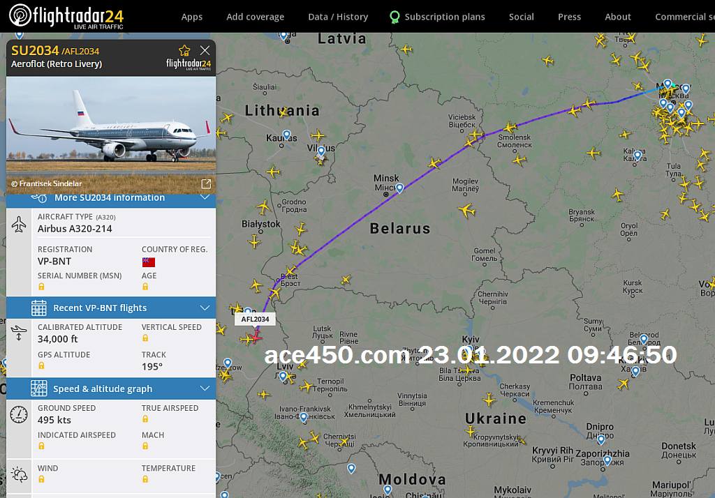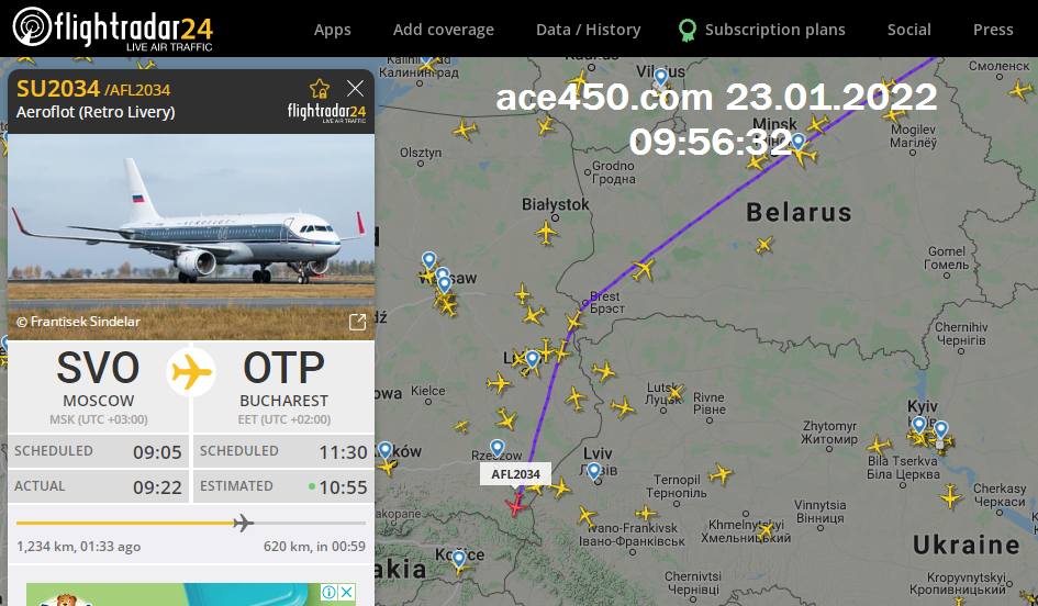 Сегодня отмечена интересная особенность полетов самолетов над территорией Украины — российский SU2034 авиакомпании Aeroflot (Аэрофлот) летит из Москвы в Бухарест старательно облетая стороной территорию Украины.