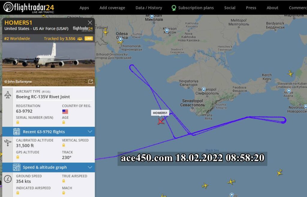 Самолеты НАТО ведут разведку в небе Украины и над Черным морем Сегодня, 18 февраля 2022 года в небе Украины и над акваторией Черного моря ведут разведывательную деятельность два ЛА HOMER51 00