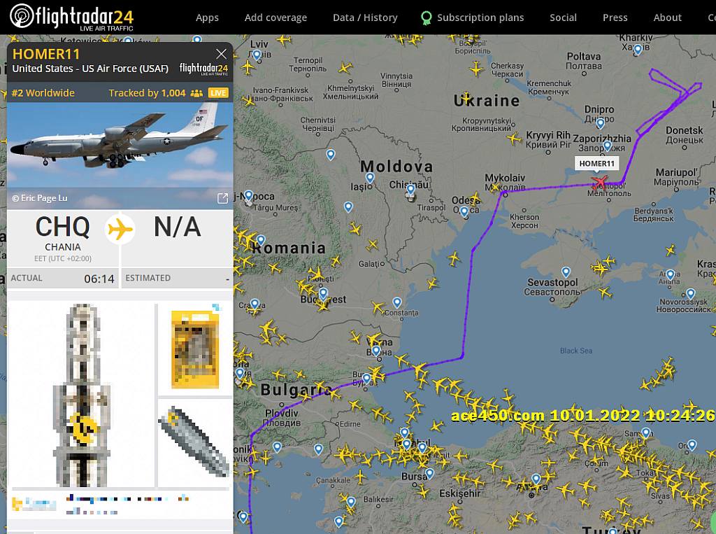 Разведку на высоте 10 километров ведет Boeing RC-135V Rivet Joint вылетевший утром с острова Крит в Средиземном море.