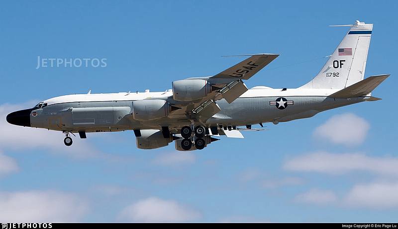 Скорость патрулирования американского самолета разведчика Боинг 135-й в небе Украины составляет 730 км/час.