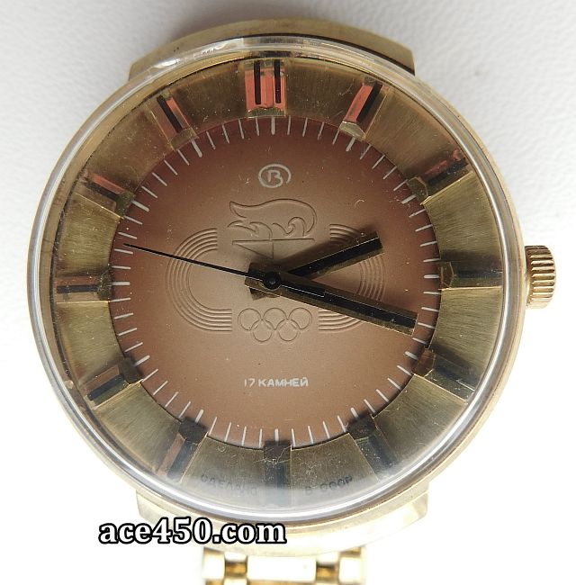 Советские часы Восток 17 камней экспортный ушастый позолоченный корпус. Тематика — Олимпиада 80. Периферия часов Восток 17 золотистая с гранеными делениями с черной серединой.