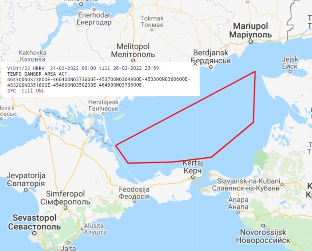 «Tempo Danger Area. SFC — Unlimited» (Временно опасная зона. Площадь не ограничена — Ред.), говорится в сообщении. И приводятся координаты опасного участка, который покрывает большую часть Азова.