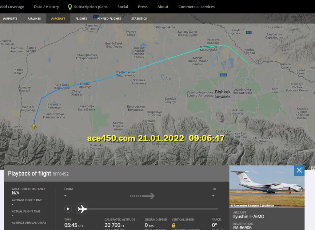Сегодня, 21 января 2022 года сервис отслеживания полетов заметил короткое включение транспондера российского военно-транспортного самолета на подступах к аэродрому рядом со столицей Бишкек Киргизии.