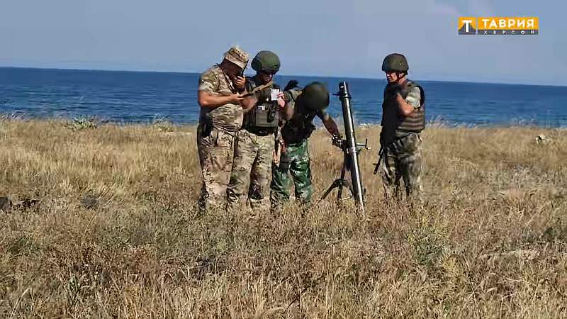 Training shooting with live ammunition is carried out at the Arabat Spit directly near the beach area. In the same place, on the shores of the Sea of Azov, exercises are also taking place with the use of mortars.