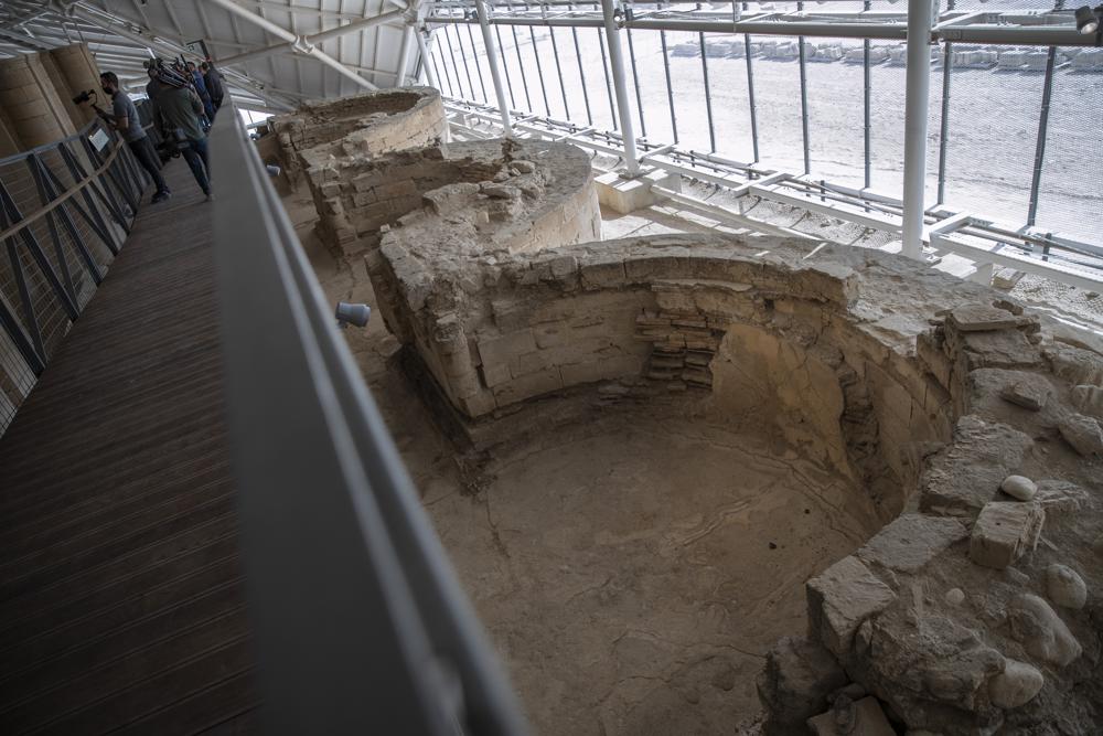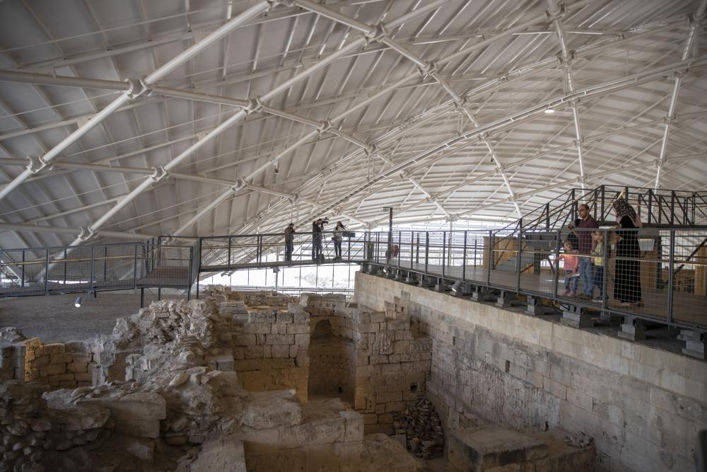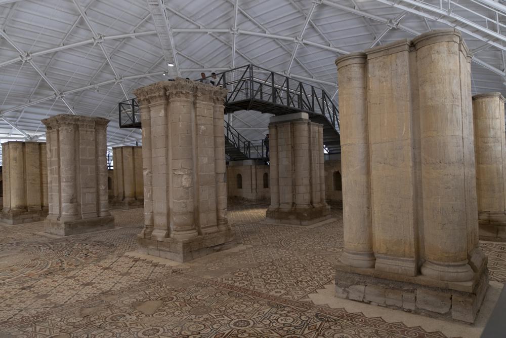 Недавно построенный купол покрывает мозаику 7-го века площадью 827 квадратных метров (8900 квадратных футов), которая была открыта для публики на исламском археологическом участке во дворце Хишам, к северу от города Иерихон на Западном берегу. 28 февраля 2021 года. Один из самых известных археологических памятников на оккупированном Западном берегу, где находится одна из крупнейших мозаик исламского мира, был оборудован куполом и воздушной дорожкой после того, как он прошел многомиллионный проект, финансируемый Японией, который позволяет туристам посетить это место, не повредив мозаику, а также защитить древние руины от непогоды. (AP Photo / Nasser Nasser)