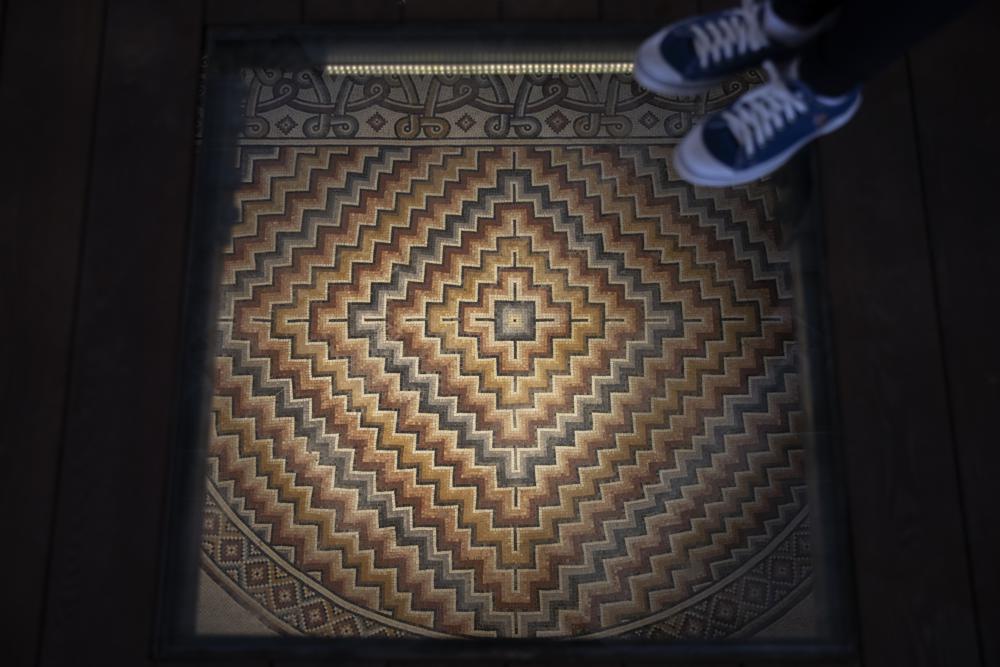 Отреставрированная часть мозаики 7-го века площадью 827 квадратных метров (8900 квадратных футов), которая была открыта для публики, на исламском археологическом участке во дворце Хишам, к северу от города Иерихон на Западном берегу, в четверг, 28 октября. , 2021. Один из самых известных археологических памятников на оккупированном Западном берегу, где находится одна из крупнейших мозаик исламского мира, был оборудован куполом и воздушной дорожкой после того, как он прошел многомиллионный проект, финансируемый Японией, который позволяет туристам посетить это место, не повредив мозаику, а также защитить древние руины от непогоды. (AP Photo / Nasser Nasser)