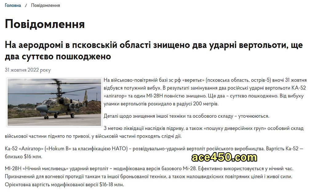 Интересная информация размещена на сайте украинского ГУР. Там сообщается о взрывах на аэродроме в Псковской области в результате которых уничтожено три боевых вертолета ВС РФ.