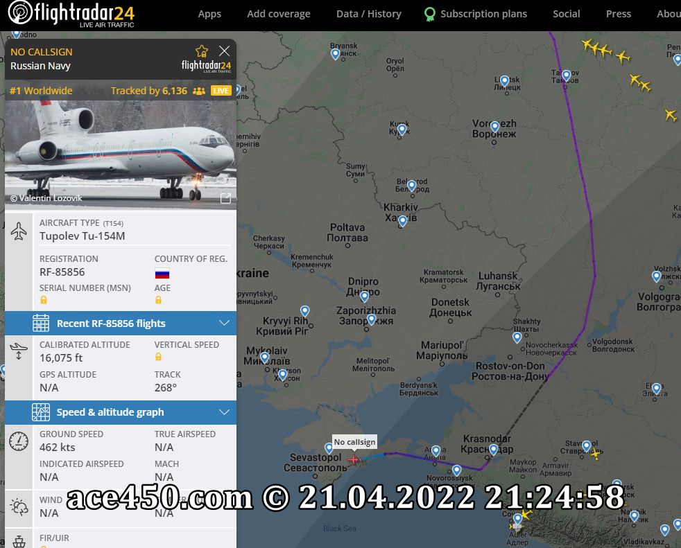 В Крым сегодня вечером прилетел самолет Tupolev Tu-154M приписанный к ВМФ России из Москвы. Очевидно что этот рейс имеет какое-то отношение к расследованию трагедии затонувшего флагмана Черноморского флота РФ крейсера «Москва»