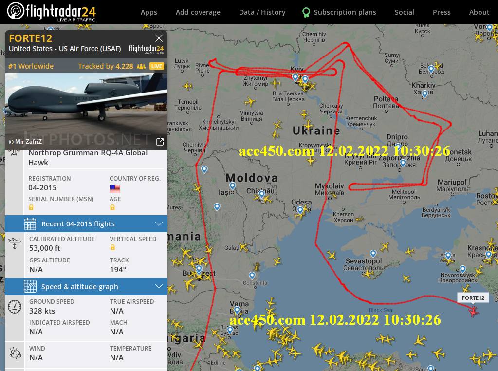 С разведывательной миссией в небе над Украиной с раннего утра летает американский стратегический разведывательный дрон Northrop Grumman RQ-4A Global Hawk .