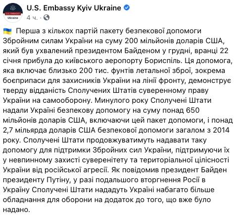 Утром 22 января в Украину прибыла первая из нескольких партий пакета военной помощи от США на сумму 200 млн долларов, выделение которой санкционировал президент США Джо Байден в декабре 2021 года.