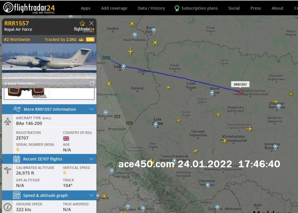 Именно этот самолет BAe 146-200 из Великобритании везет оружие для Украины в условиях возможной агрессии Российской Федерации.