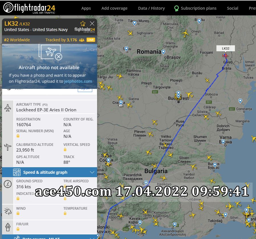 Предполагается что полет Lockheed EP-3E Aries II Orion с позывным LK32 военно-морского флота США рядом с акваторией Черного моря в Румынии связан с гибелью российского флагмана крейсером «Москва»