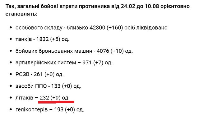 В потерях ВС России за 9 августа украинский Генштаб показал +9 российских самолетов. Очевидно что это потери России на аэродроме в Новофедоровке в Крыму.