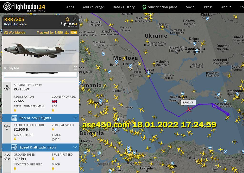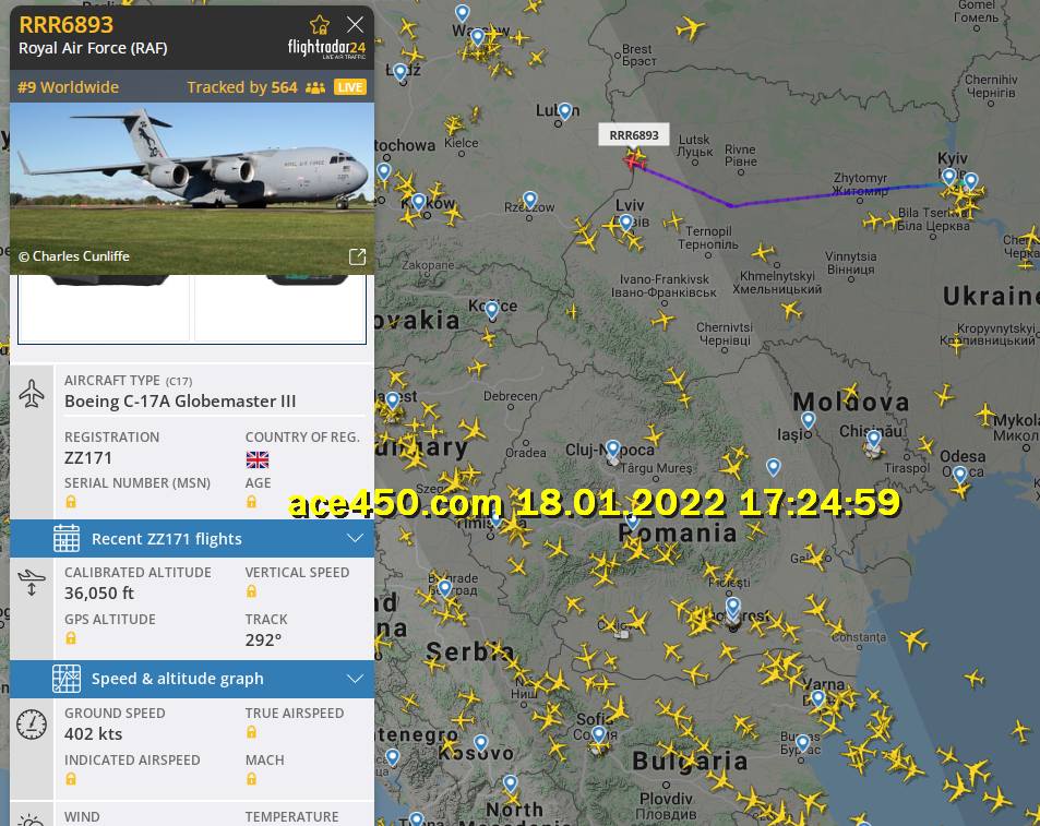 Отмечено появление не только нескольких разведывательных самолетов в небе над Украиной и над акваторией Черного моря но и военно-транспортные самолеты Великобритании которые привезли по видимому вооружение.
