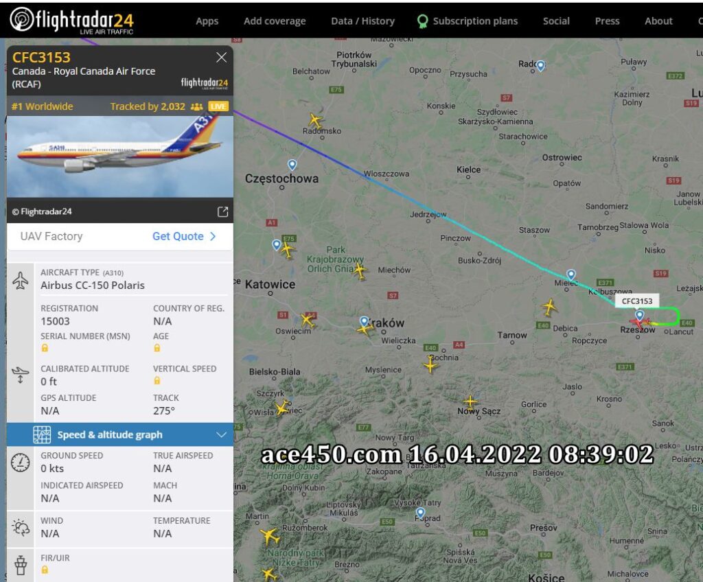 Польский Жешув используется странами НАТО как логистический транспортный узел для снабжения армии Украины вооружением и боеприпасами. В данный момент канадский Airbus CC-150 Polaris — переоборудованный под транспортник пассажирский Airbus A310-300 доставляет груз из американского города Трентон в штате Нью-Джерси.