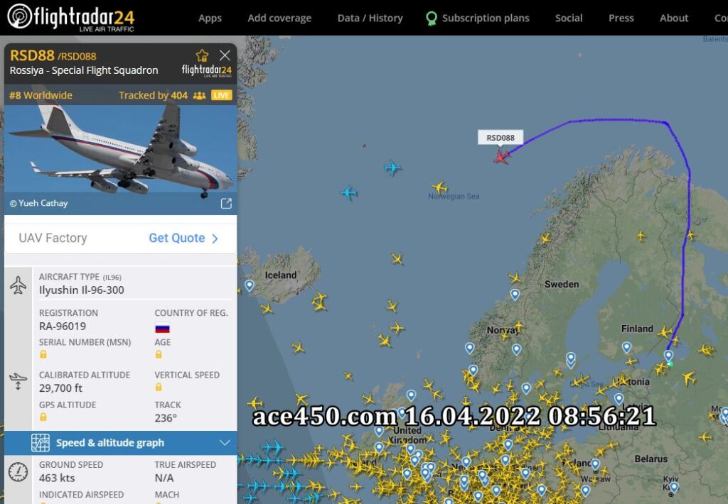 Из российского Петербурга в сторону США оправляется специальный правительственный рейс ИЛ-96-300 с позывным RSD88. Самолет не заходит в воздушное пространство третьих стран огибая их и летит над нейтральными водами Атлантики