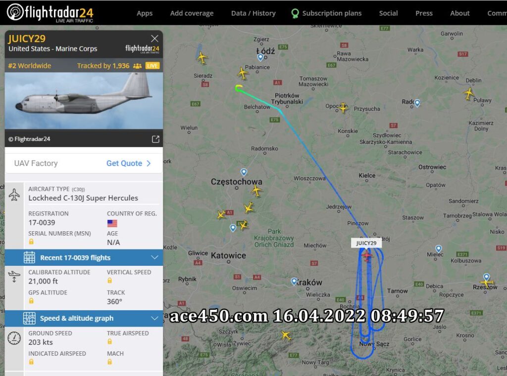 В районе польского аэродрома Жешув ожидает очередь на посадку военно-транспортный самолет Корпуса морской пехоты США С-130 Геркулес с грузом вооружений для ВСУ Lockheed C-130J Super Hercules это американский военно-транспортный самолёт средней и большой дальности