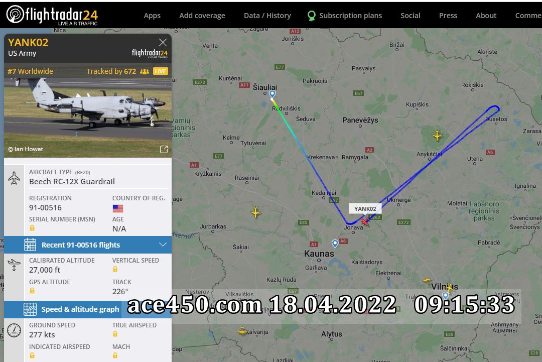 В районе литовско-беларусской границы замечено присутствие самолета тактической аэроразведки США с позывным YANK02. Это самолет радио- и радиотехнической разведки Beechcraft RC-12X Guardrail осуществляющий разведывательные полеты вдоль границы с Беларусью над территорией Литвы.