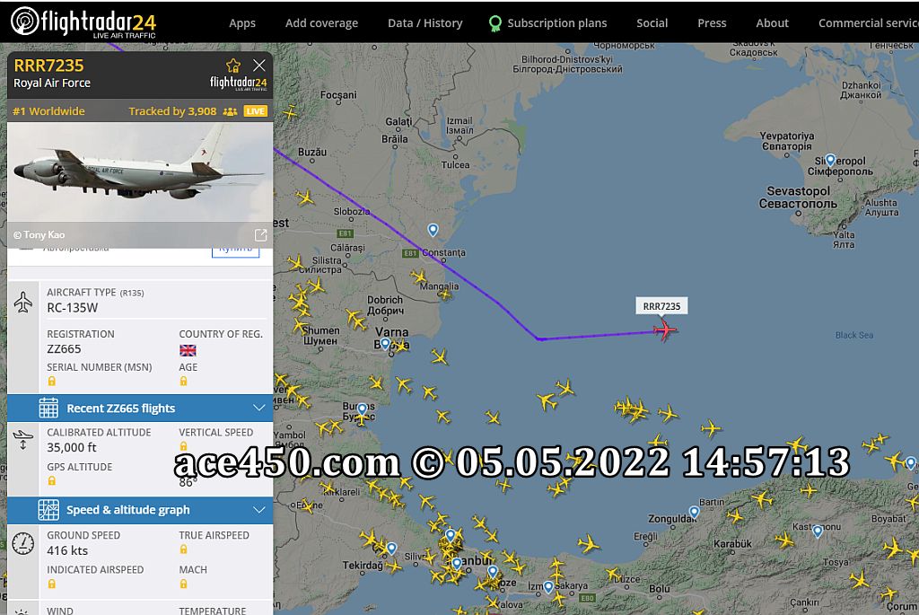 RC-135W ВВС Великобритании регистрационный номер ZZ665 позывной RRR7235 начал пилотируемые полеты разведывательной авиации над акваторией Черного моря в районе Крыма.