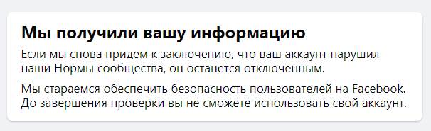 Аккаунт блокируется, понятно что для вашего блага но фейсбучный монстр милостиво обещает рассмотреть ваше нарушение и разрешить сливать вашу личную информацию на сервера Фейсбука.