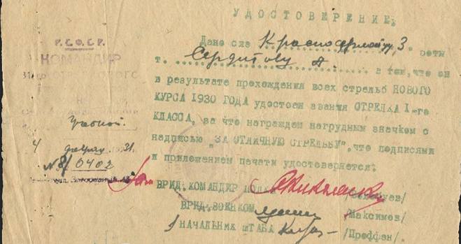 Знак за отличную стрельбу выдавался вместе с удостоверением с подписями и печатями