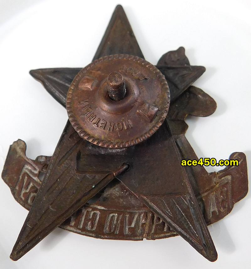 Хорошо видно что конструктивно знак «За отличную стрельбу» состоит из трех частей. Это собственно изображение красноармейца, щиток в виде вытянутой звезды и винта с заверткой с помощью которых знак крепится на одежду.