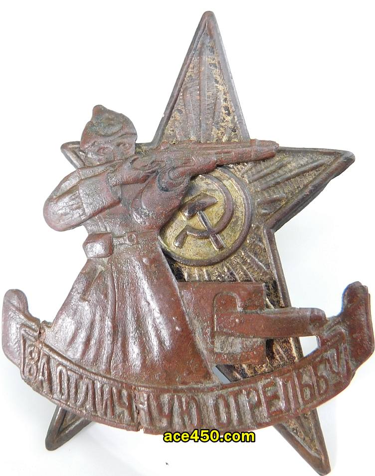 Фото знака «За отличную стрельбу» . Представляет собой изображение красноармейца в буденновке целящегося из винтовки.