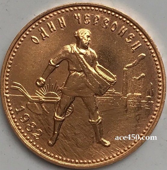 Золотой советский червонец «Сеятель» отштампованный в 1982 году это довольно редкая золотая монета на просторах экс-СССР. Реплика золотого червонца двадцатых годов прошлого века была абсолютно не доступна для рядовых советских граждан в 80-е годы прошлого века.